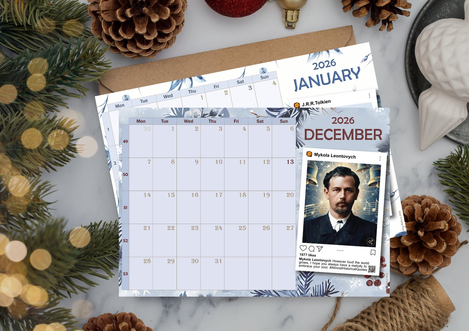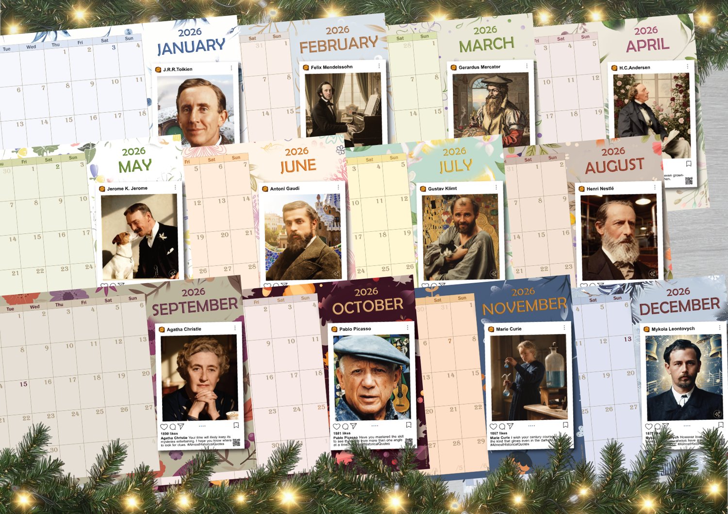 Start each month inspired by witty, humorous and just supportive quotes by J.R.R.Tolkien, Jerome K. Jerome, A.Gaudí, P.Picasso, M.Curie, and others! The calendar is illustrated with colourful high-quality portraits of the personalities and looks modern and charmy whether in a living room, office, or classroom.